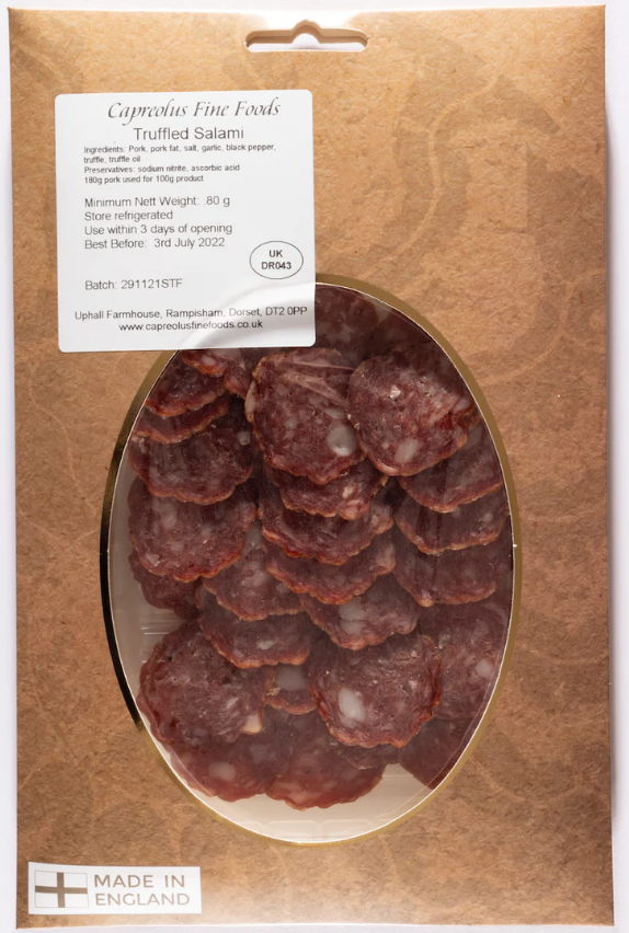 Free range pork is ground and seasoned with garlic and black pepper, then chopped Italian black truffle is added.